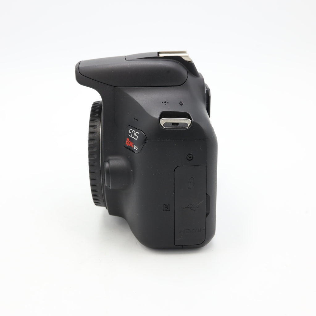 Canon Brings Wi-Fi to Entry-Level Rebel T6 DSLRRead More \nComprising a versatile set of imaging capabilities along with support for a connected workflow, the EOS Rebel T6 from Canon is a compact, sleek DSLR featuring an 18MP APS-C CMOS sensor and a DIGIC 4+ image processor. Combined, these two technologies avail rich image quality with reduced noise, along with a native sensitivity range of ISO 100-6400 that can be further expanded to ISO 12800 to suit working in low and difficult lighting conditions. The sensor and processor also enable the ability to shoot continuously at 3 fps for photographing moving subjects, as well as recording Full HD 1080p/30 video. Benefitting shooting with the optical viewfinder, a 9-point AF system incorporates a single Centercross-type AF point for increased accuracy and focusing speed, and a contrast-detection focusing system offers refined autofocus precision for shooting movies or working in live view. The rear 3.0" 920k-dot LCD offers a bright, clear image for playback and review, and built-in Wi-Fi with NFC also offers the ability0to wirelessly share imagery from your camera to a linked mobile device for instant online sharing.