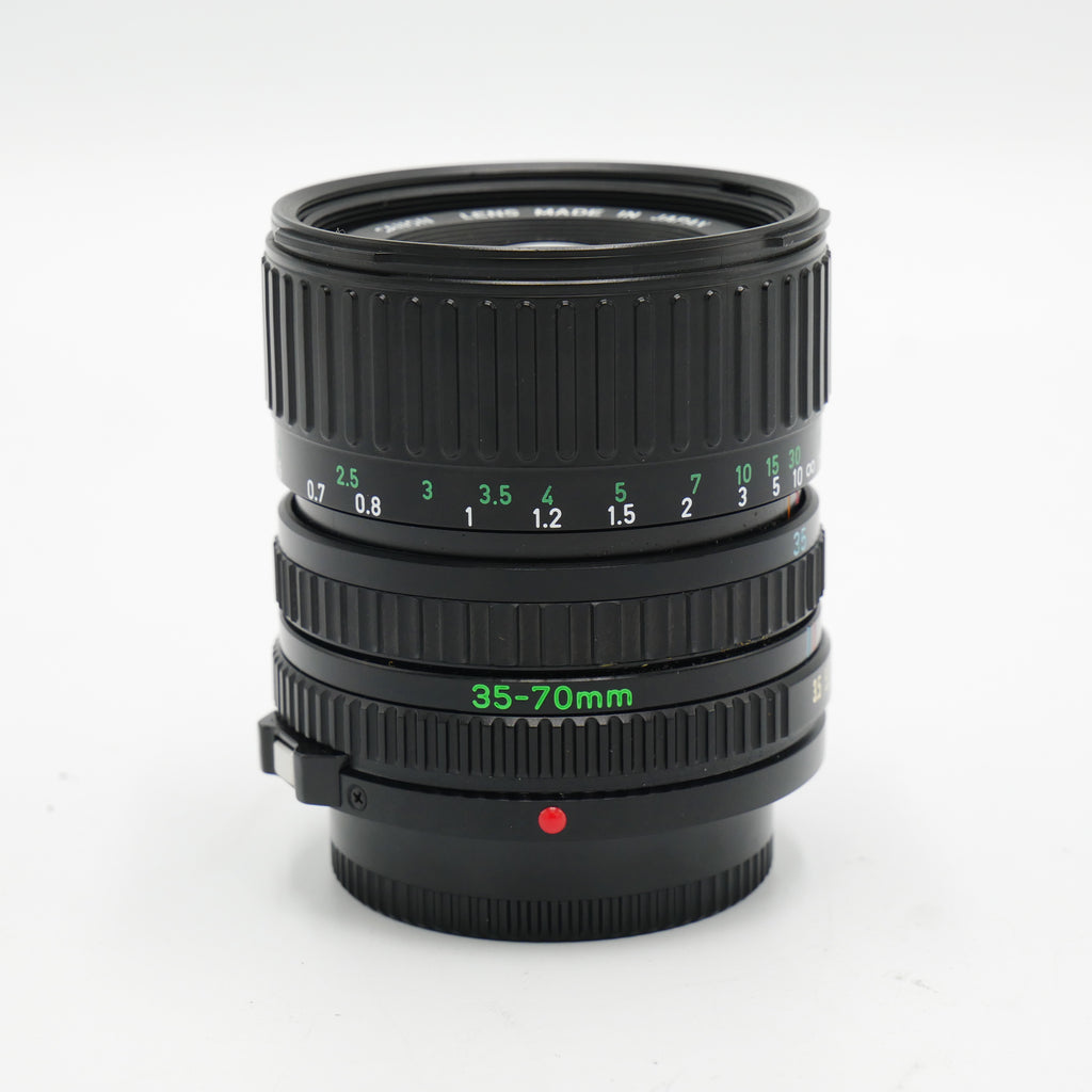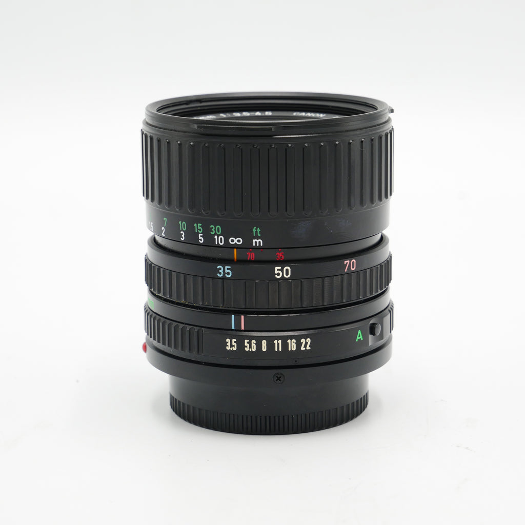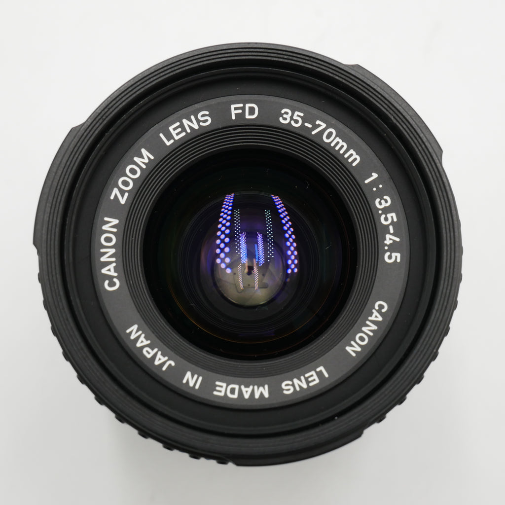 The Canon FD 35-70 f/3.5-4.5 is a lightweight, compact zoom wide-angle lens covering the normal 50mm focal length with the option a a slightly wider or narrower view. This lens was the first to be offered with a three-moving-groups focusing system which allowed for extreme compactness and light weight (200g).