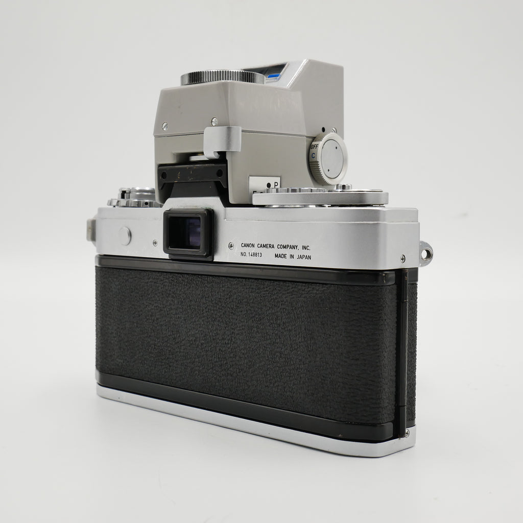 Completing this advanced analog kit is the Canon Meter Booster, a specialized accessory designed to extend the camera's TTL (through-the-lens) metering range into extreme low-light conditions. It mounts to the accessory shoe and connects directly to the camera’s battery compartment via a dedicated plug, effectively increasing the sensitivity of the internal CdS photocell. This allows photographers to obtain accurate exposure readings in environments that would be too dark for the standard meter to register. Together, these components form a sophisticated vintage system that offers a unique shooting experience, particularly for those interested in the technical nuances of early SLR development and high-speed optics.