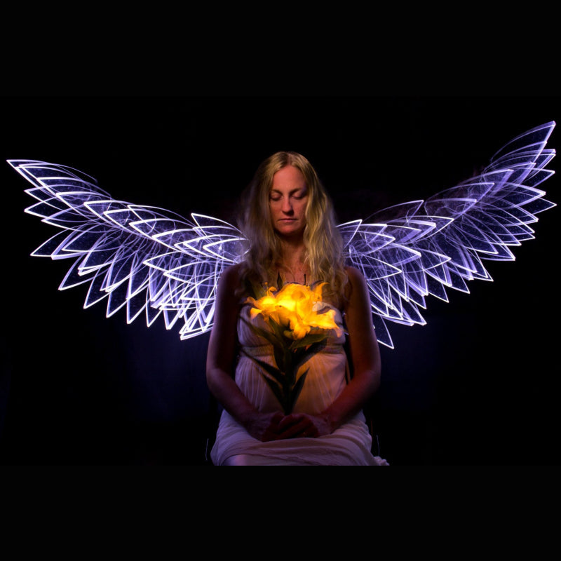 The Light Painting Brushes Feather Plexiglass light painting tool, also known as a Light Blade, was created with wings in mind. Cut to the outline of the classic feather shape, the edges are hand sanded for maximum edge illumination. When connected with a light-emitting device the edges of this brush shine super bright. While this is the perfect tool for creating beautiful wings, this light painting tool will also create a beautiful light texture when waved about. A great light painting tool for portrait work, light graffiti, light orbs, or abstract light painting photography.