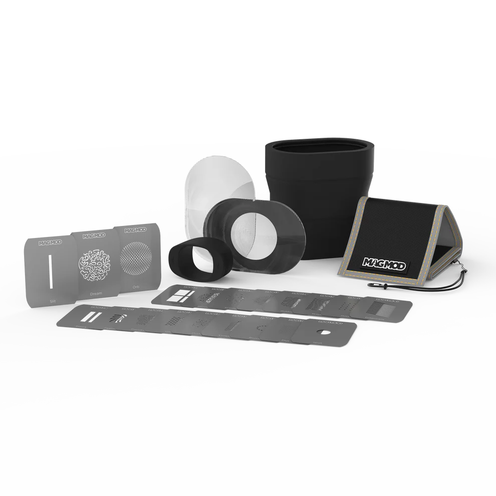 Create stunning patterns with your flash using the MagMask Kit from MagMod. This set features 20 unique MagMask patterns and a wide lens that directs light for accurate projection. When paired with the separately available MagBeam, the MagMask kit is perfect for photographers looking to achieve creative and distinctive visual effects. Elevate your photography with the MagMask kit, creating unique images effortlessly.