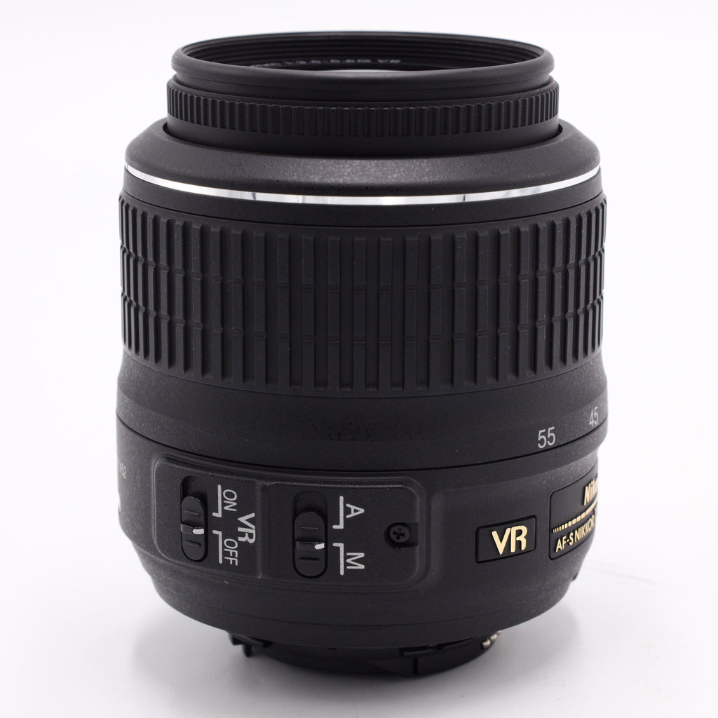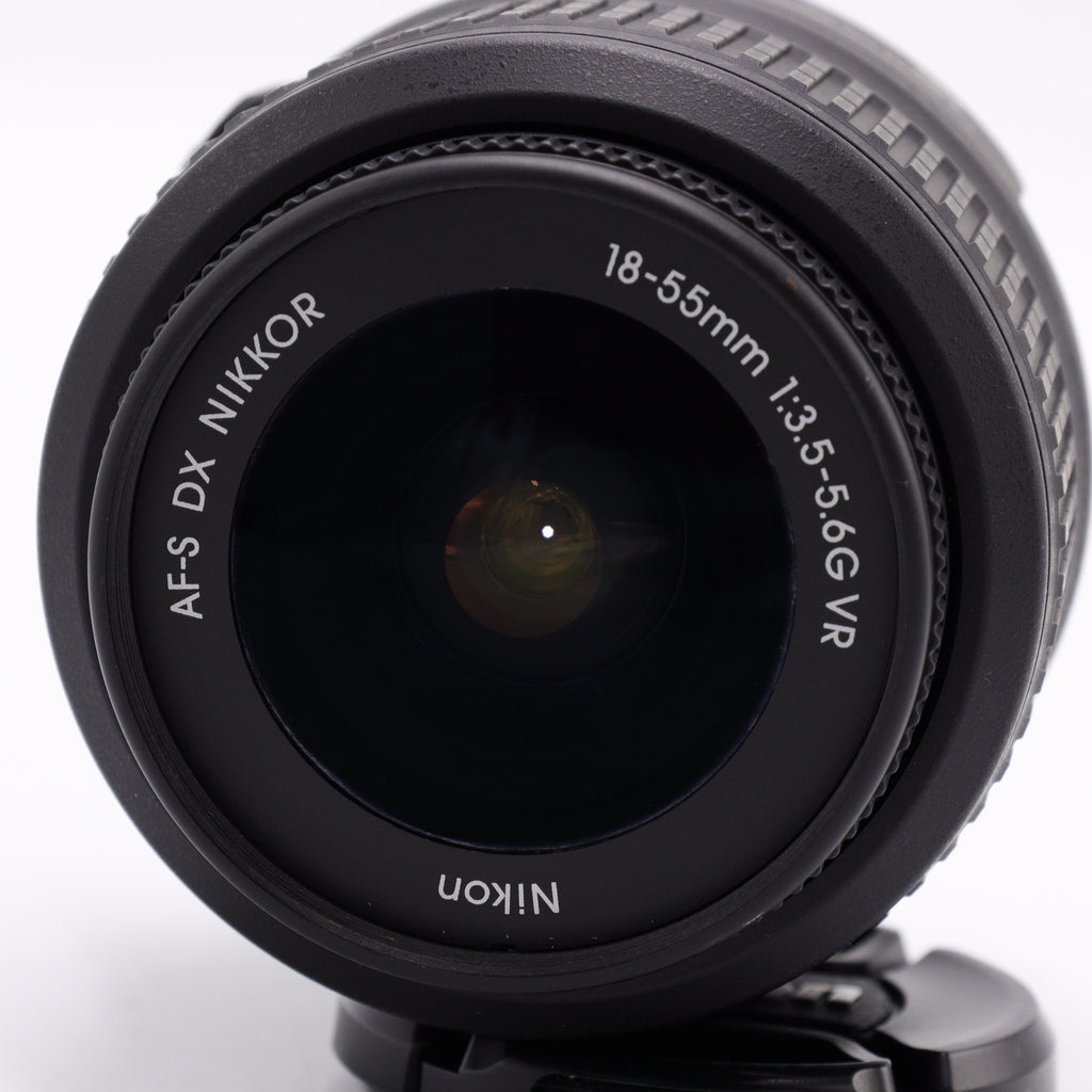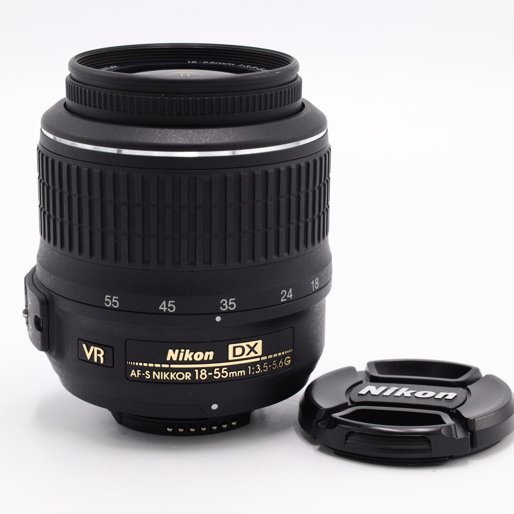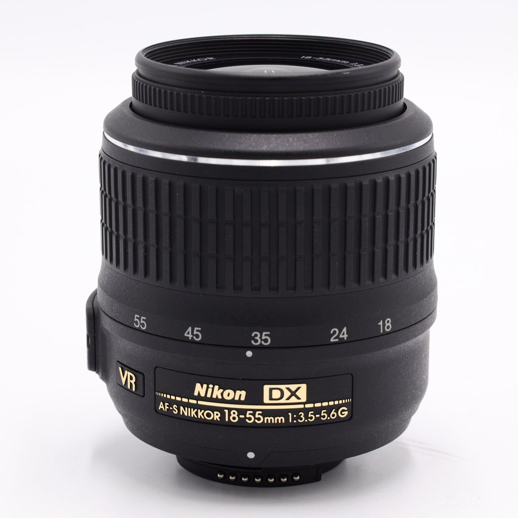 The Nikon AF-S DX NIKKOR 18-55mm f/3.5-5.6G VR Lens is an ultra compact, lightweight standard zoom lens that has a 27-82.5mm equivalent zoom range and is designed for use with compact DX-format DSLRs. This lens offers the most basic zoom range in the DX lens series and will conveniently cover everything from tight indoor portraits to standard snap shots. The innovative Vibration Reduction (VR) system allows handheld telephoto zoom shooting even in poorly lit conditions. It minimizes image blur caused by camera shake, and offers the equivalent of shooting at a shutter speed 3 stops (8 times) faster.