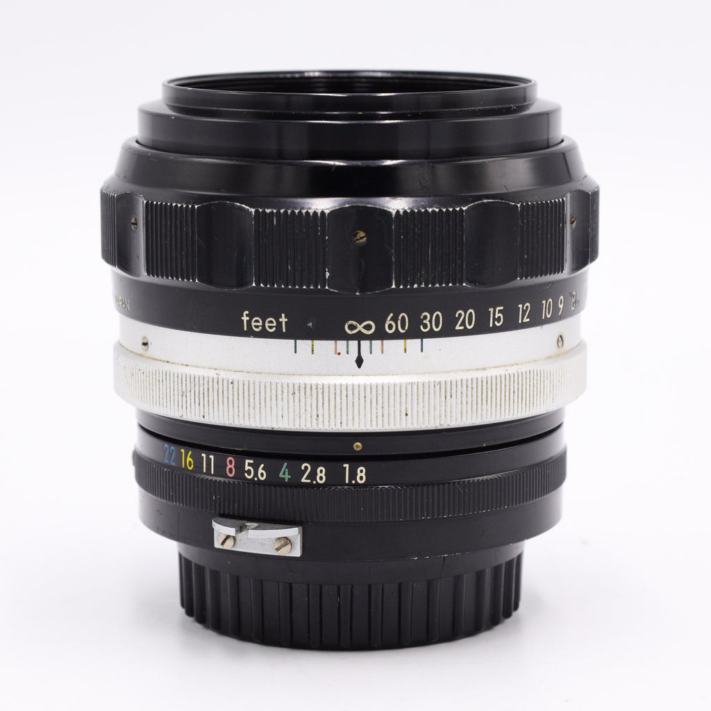 Technically, this lens is built with the "all-metal and glass" philosophy of the pre-AI era, featuring a robust scalloped focus ring and a deeply recessed front element. It offers a fast f/1.8 maximum aperture, making it an exceptional tool for low-light photography and tight headshots with a shallow depth of field. The "Auto" in the name refers to the automatic diaphragm, which allows the lens to stay wide open for bright focusing and only stops down to the selected aperture at the moment the shutter is released.