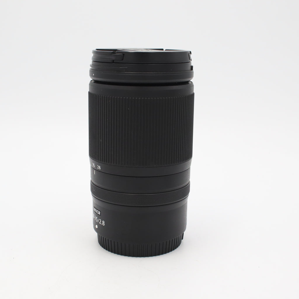 This Nikon NIKKOR Z 28-75mm f/2.8 is in Excellent condition, showing virtually no signs of handling on its lightweight, weather-sealed barrel. The optics are pristine and free of scratches, haze, or internal dust, featuring a Super ED and an Extra-low Dispersion (ED) element that ensure impressive clarity and color accuracy across the entire zoom range. Mechanically, the stepping motor (STM) provides near-silent, rapid autofocus, while the programmable control ring operates with factory-standard smoothness. This near-mint copy is a high-value alternative to the S-Line 24-70mm f/2.8, offering a bright constant aperture and an incredibly close 7.5-inch minimum focus distance for dynamic, macro-style perspectives in a more compact, travel-friendly design.