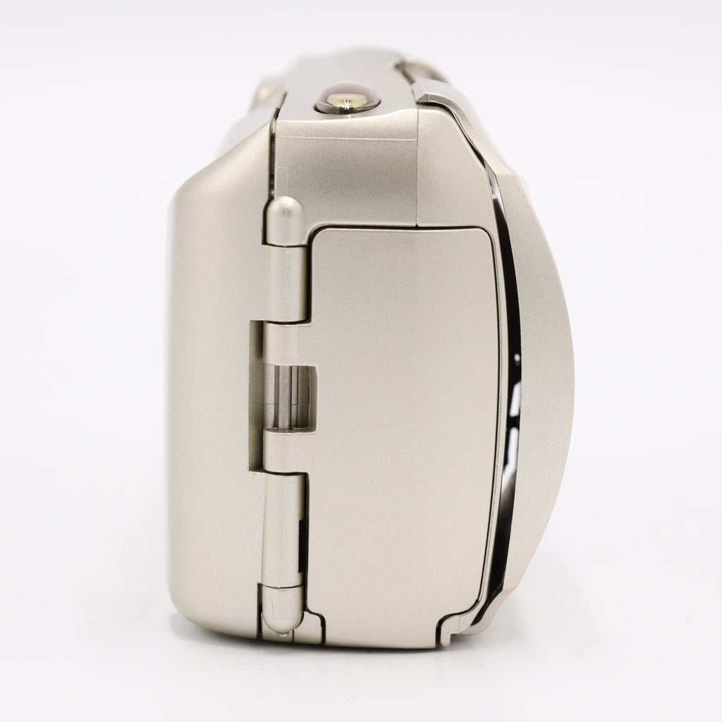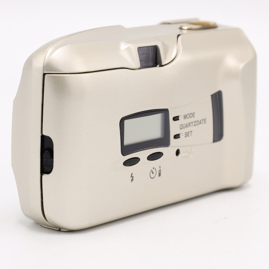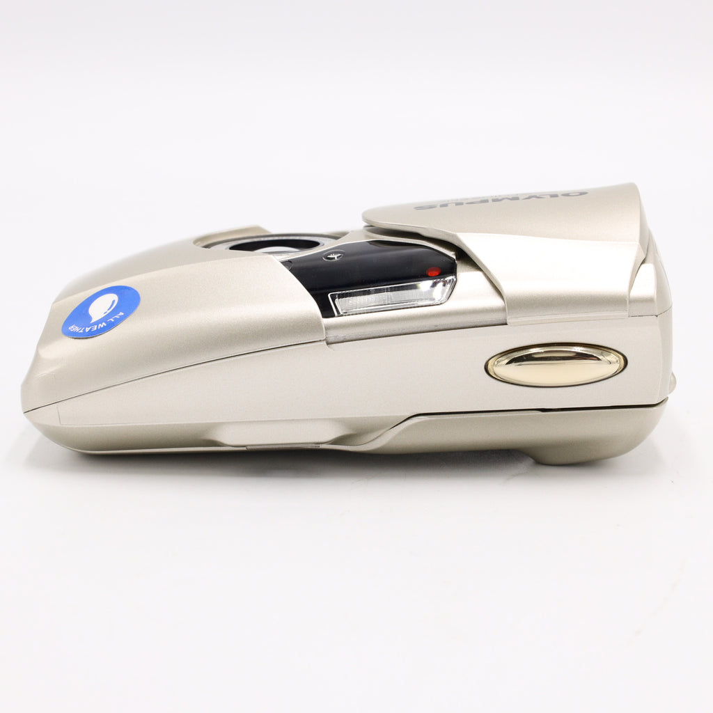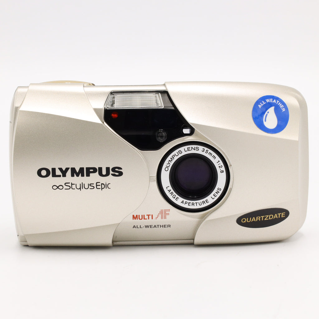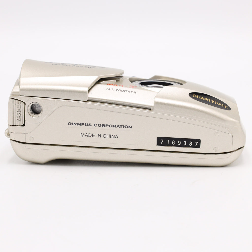 The Olympus Stylus Epic, globally recognized as the Mju II, is a premier 35mm point-and-shoot camera distinguished by its remarkably fast and sharp 35mm f/2.8 Zuiko prime lens. This "Champagne" edition features a sophisticated yellowish-silver finish on its high-quality plastic body, which is designed with a signature sliding clamshell cover that protects the lens and powers the unit on instantly. A key technical advantage of this model is its active multi-beam autofocus system, which utilizes over 400 focus steps to ensure precise subject acquisition even in challenging compositions.