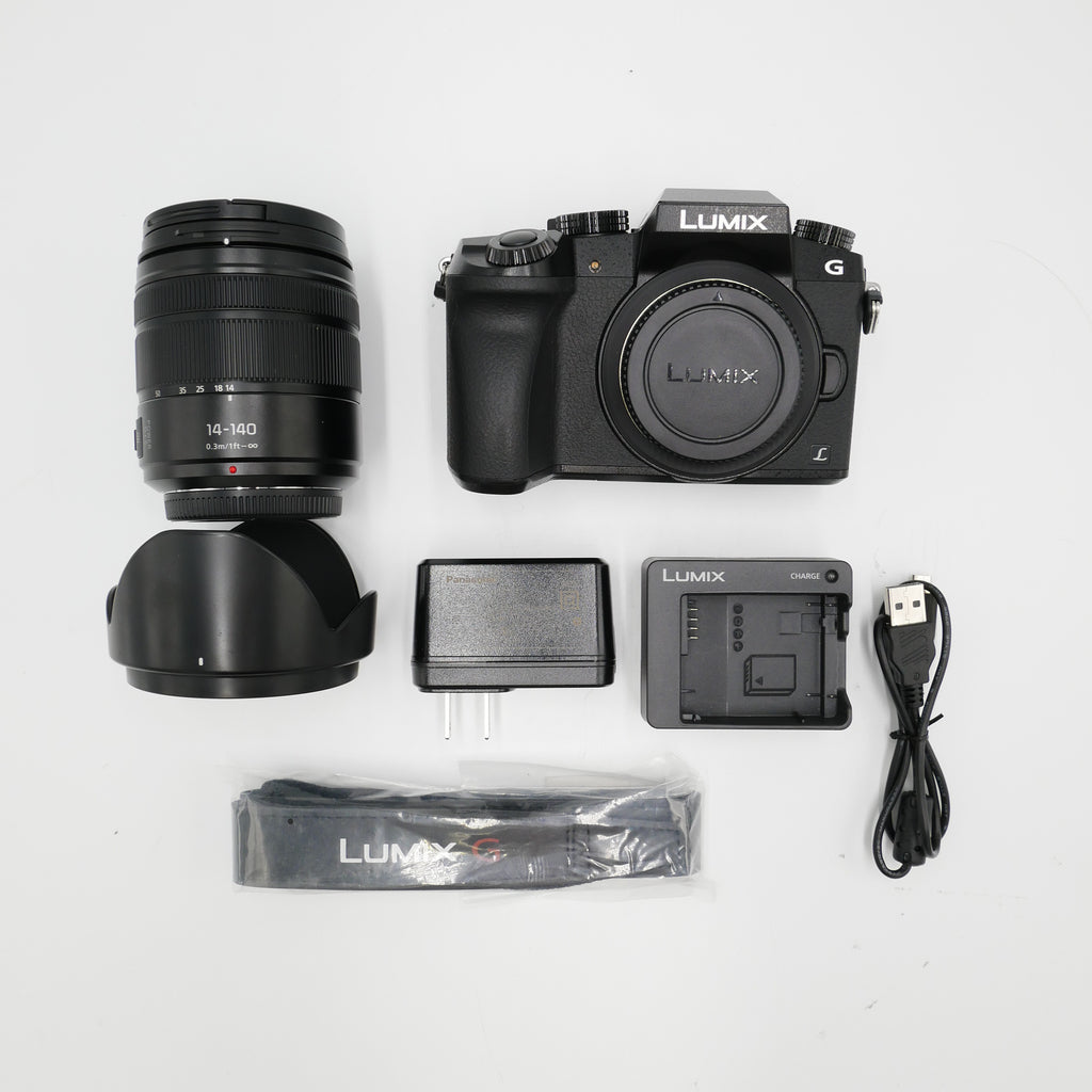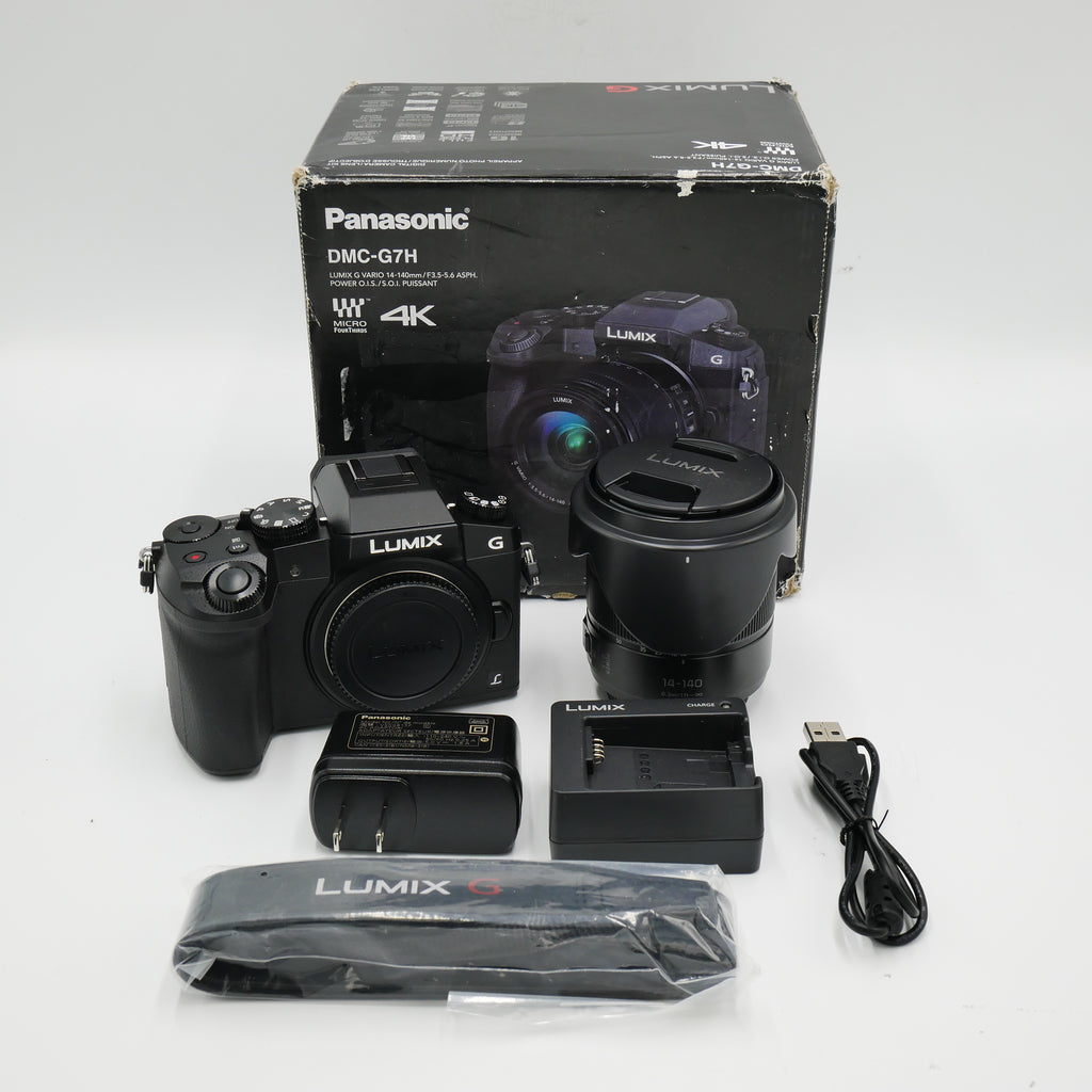 | In The Box | Panasonic Lumix G7 Mirrorless Camera, Panasonic Lumix G Vario 14-140mm f/3.5-5.6 ASPH. POWER O.I.S. Lens (Black), Rechargeable Lithium-Ion Battery, Battery Charger, Body Cap, Hot Shoe Cover, Shoulder Strap, USB Connection Cable, Software DVD-ROM, Limited 1-Year Manufacturer Warranty |