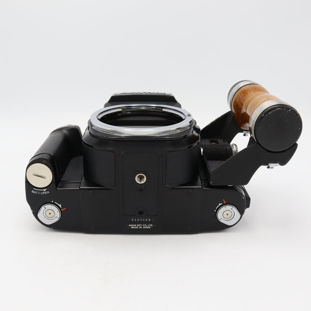 The Pentax 67 II is a robust, high-end medium-format SLR introduced in 1998, offering 6x7 cm negatives with the large image area prized by landscape, portrait, and studio photographers. It supports both 120 and 220 roll film and features an electronically-controlled focal plane shutter with speeds from 1/1000 sec to 30 sec in Aperture-Priority AE, and 4 sec to 1/1000 sec plus Bulb in Manual mode. With its dual-bayonet 6×7 mount, interchangeable finders (including an AE Pentaprism), and interchangeable focusing screens, it delivers flexible usability. Built around a sturdy die-cast metal body with refined film transport, mirror lock-up, multiple exposure, and a battery-powered LCD panel that shows your frame count, ISO, battery status, film status, and exposure info, it remains a favorite among those who want large-format capability in a single-bodied SLR.