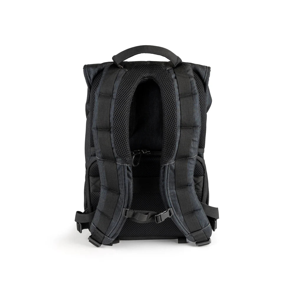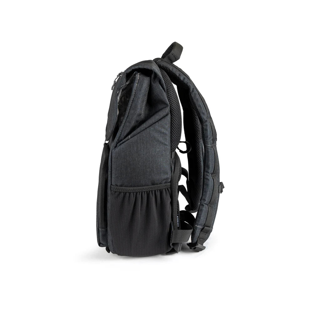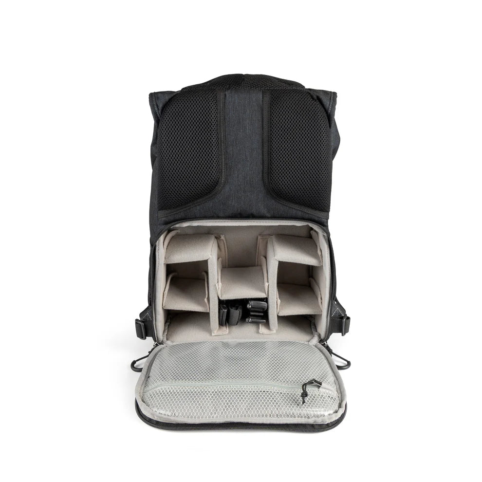 The main camera compartment is positioned against your back for added security and is accessed via a robust rear zipper. Inside, padded, movable dividers let you customize the space for a camera body, multiple lenses, a small light, and accessories. The upper compartment offers room for daily essentials—whether it’s a jacket, lunch, or more camera gear. A vertical laptop sleeve is also accessible from the top compartment, secured internally by a discreet magnetic closure. Externally, a two-stage Fidlock® latch gives you the option to adjust the top flap based on how full the bag is.