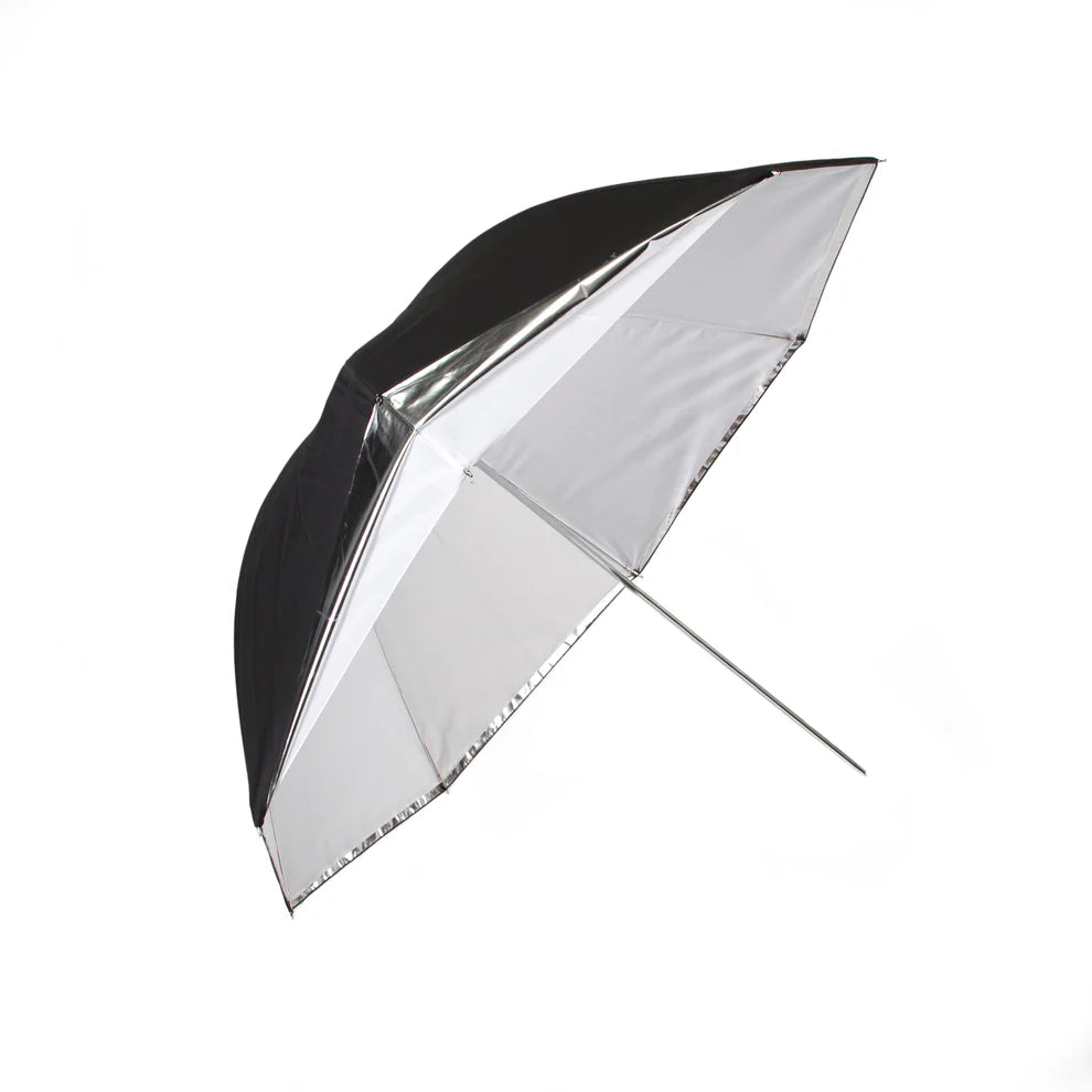 A 36" convertible umbrella which can act as a white translucent shoot-through type, or a reflective white with silver backing, or a reflective white with black backing.