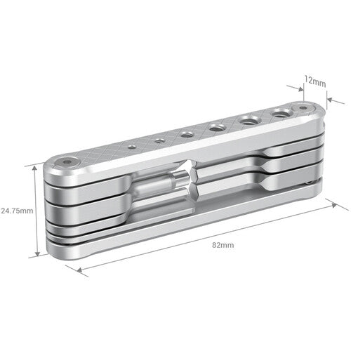 The silver SmallRig AAK2213D Foldable Multi-Tool holds many of the tools needed daily by video photographers in a compact, easy-to-carry form factor. Included are 2.5mm, 3mm, 4mm, and 3/16 Allen wrenches, one flathead screwdriver, and one Phillips screwdriver. The aluminum handle has M2.5, M3, M4, M5, and 1/4 threaded holes on one side for storing spare screws.