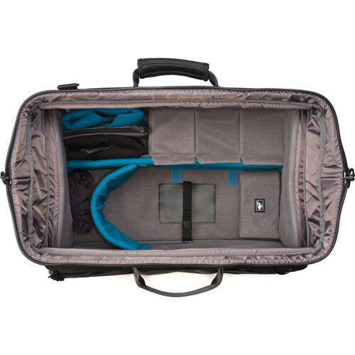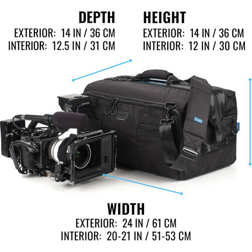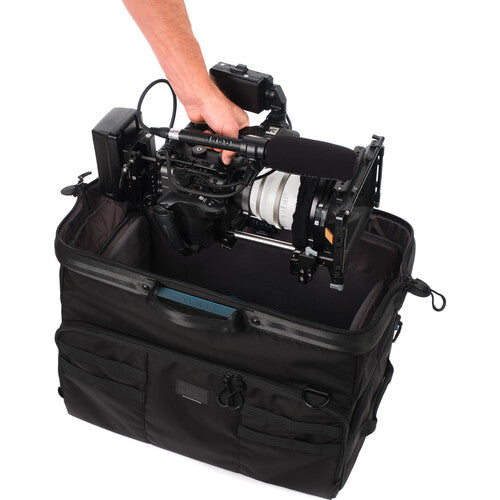 The Tenba Cineluxe V2 Shoulder Bag 24 in black is built for filmmakers and photographers who want to travel ready to shoot. With a 52L capacity, it accommodates mirrorless, DSLR, or cinema camera rigs up to 21" long, along with attached accessories such as a baseplate, matte box, monitor, and microphone. The bag’s signature doctor bag-style opening provides wide, unobstructed access down the middle, allowing you to reach your gear easily while maintaining the bag’s footprint when opened.