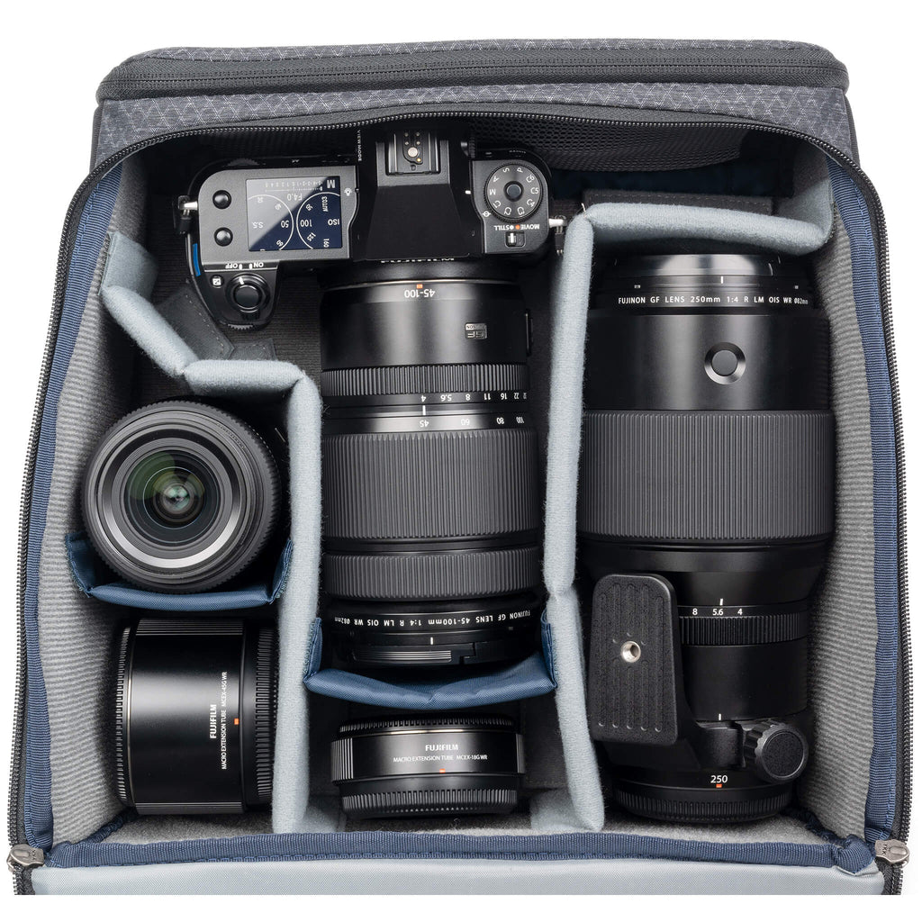 High-density velex interior and reinforced vertical dividers keep your gear secure and protected while carry handles make it easy to transport. Made from water-resistant fabrics with DWR coating, the Stash Master will keep your gear protected, and is a great solution for pros and photo enthusiasts alike. Stash Master camera cubes can also be used to increase personal gear space in a variety of Think Tank products including the Backlight® Elite 45L, and Rotation Series Backpacks.